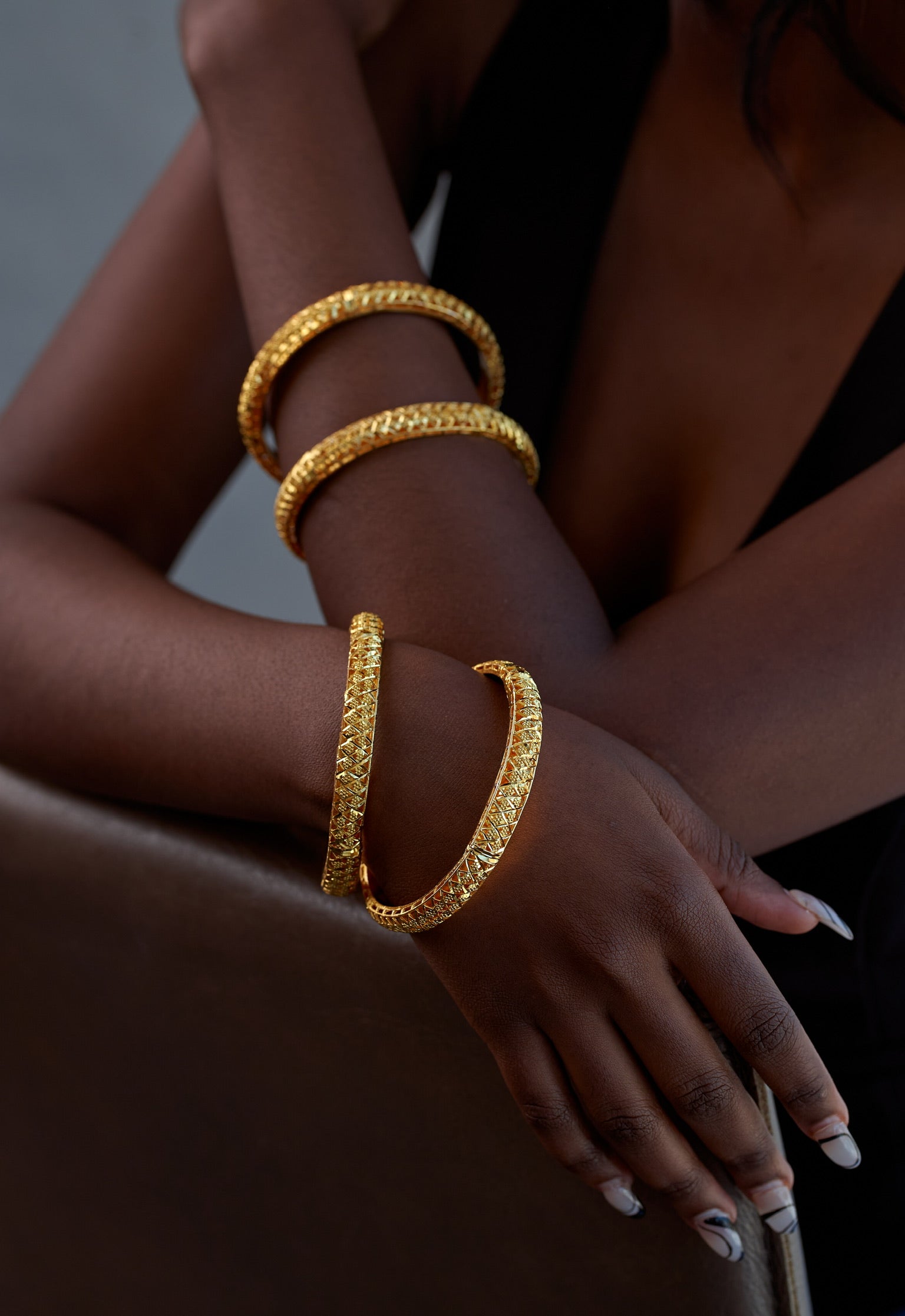 With the purchase of the Coumba Bracelets, you receive two stunning bangles that beautifully complement each other. The combination of the rhombus pattern and the luxurious gold hue creates a harmonious blend of elegance and contemporary allure.