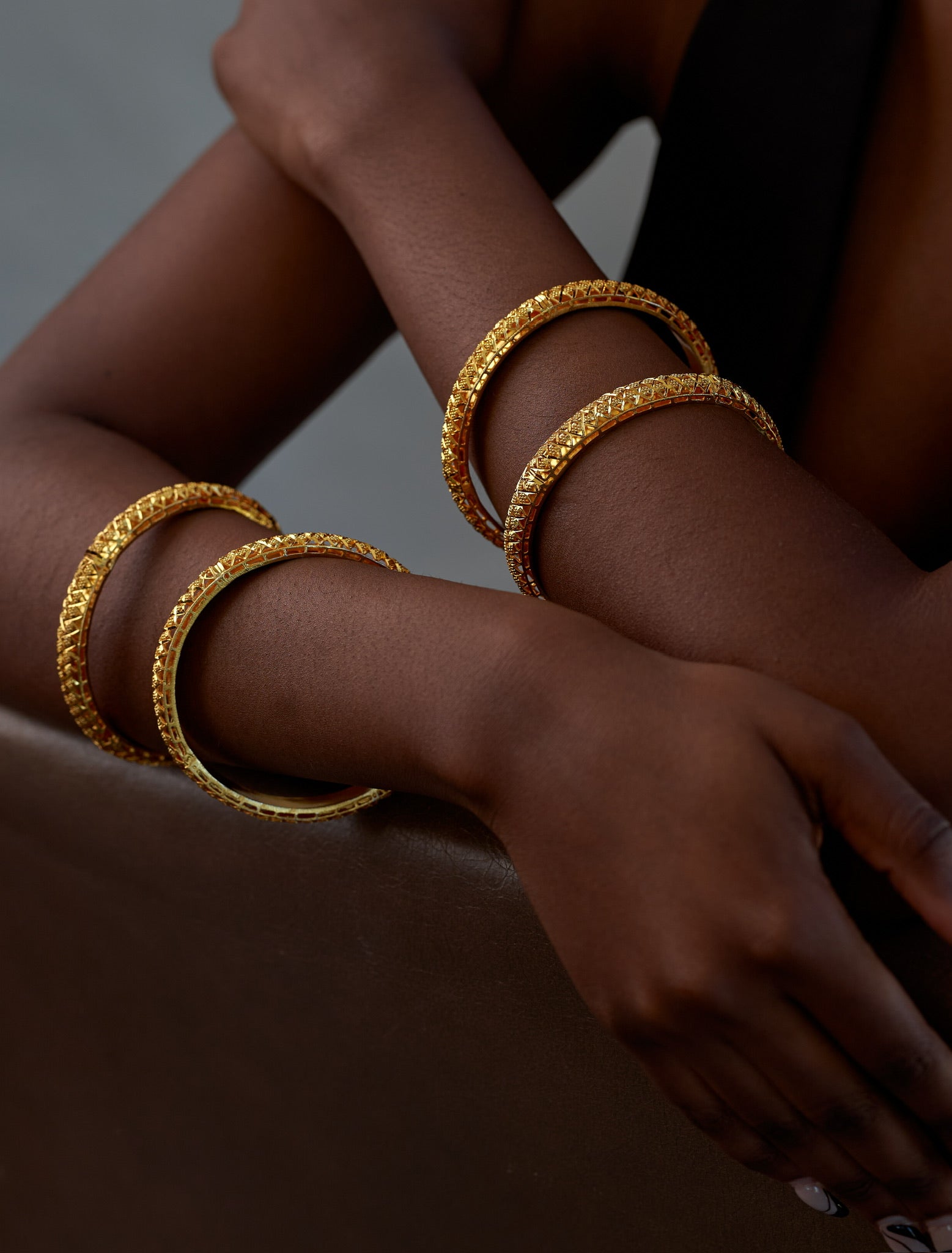 Introducing the mesmerizing Coumba Bracelets from our Nyambur Nyambur collection. These exquisite gold bangles showcase a distinctive rhombus design, making them a true statement of style and sophistication.