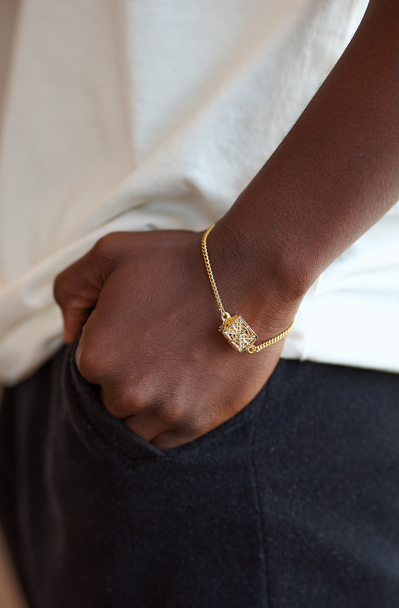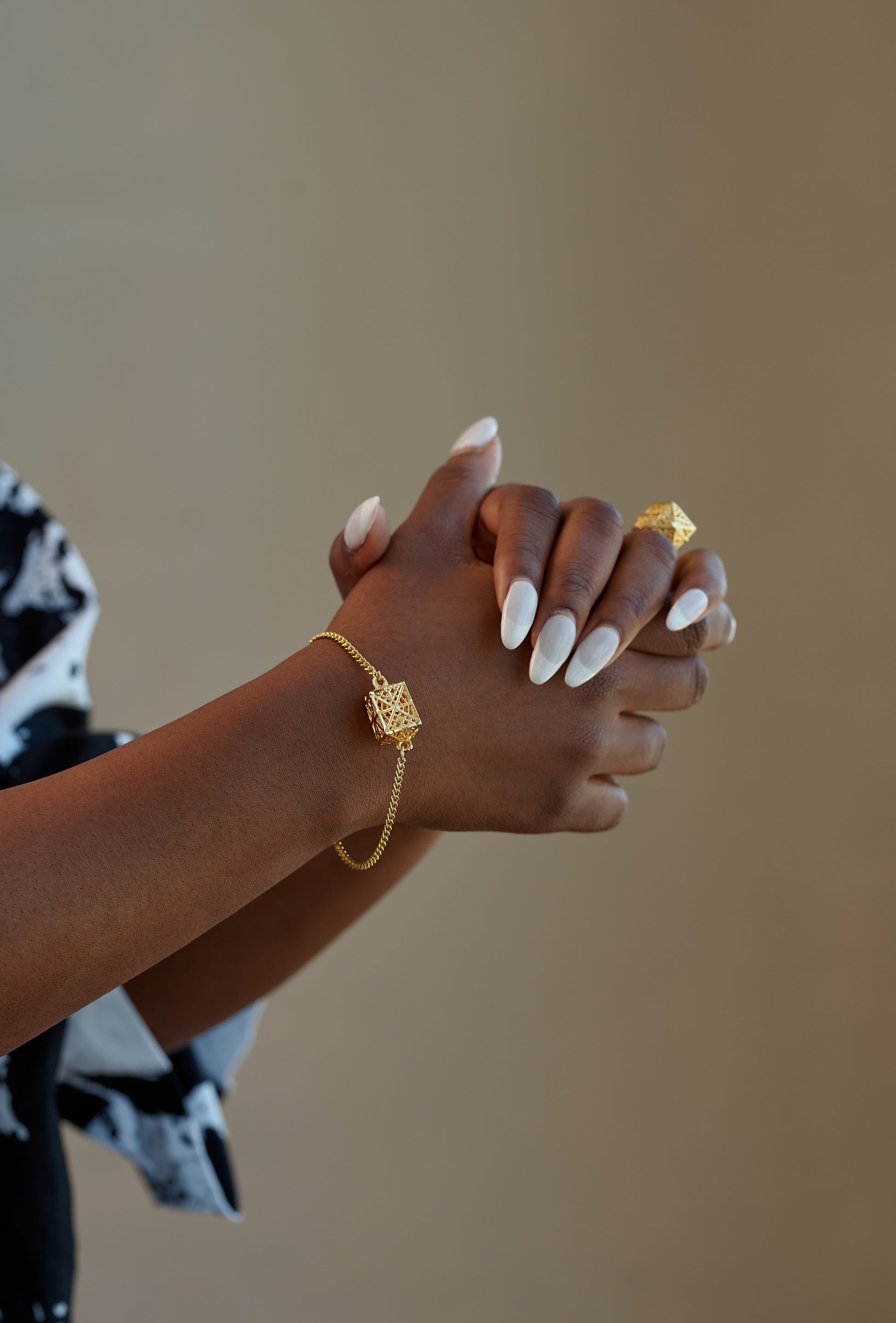 Designed to elevate any casual look or grace special occasions, our Gold Cube Bracelet is a versatile accessory that exudes elegance. It is unisex in style and comes with an adjustable size, ensuring a perfect fit for anyone.